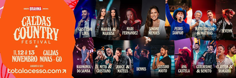 “Caldas Country Festival” conta no seu line-up com super artistas, como Gusttavo Lima, Simone Mendes, Guilherme & Benuto, Jorge e Mateus, Zé Neto & Cristiano, Maiara & Maraisa, Matogrosso & Mathias, Pedro Sampaio , DENNIS, Gustavo Mioto, Harmonia do Samba, Sevenn, Mari Fernandez, Ana Castela, Clayton & Romário e muito mais, porque a festa vai até o sol raiar.